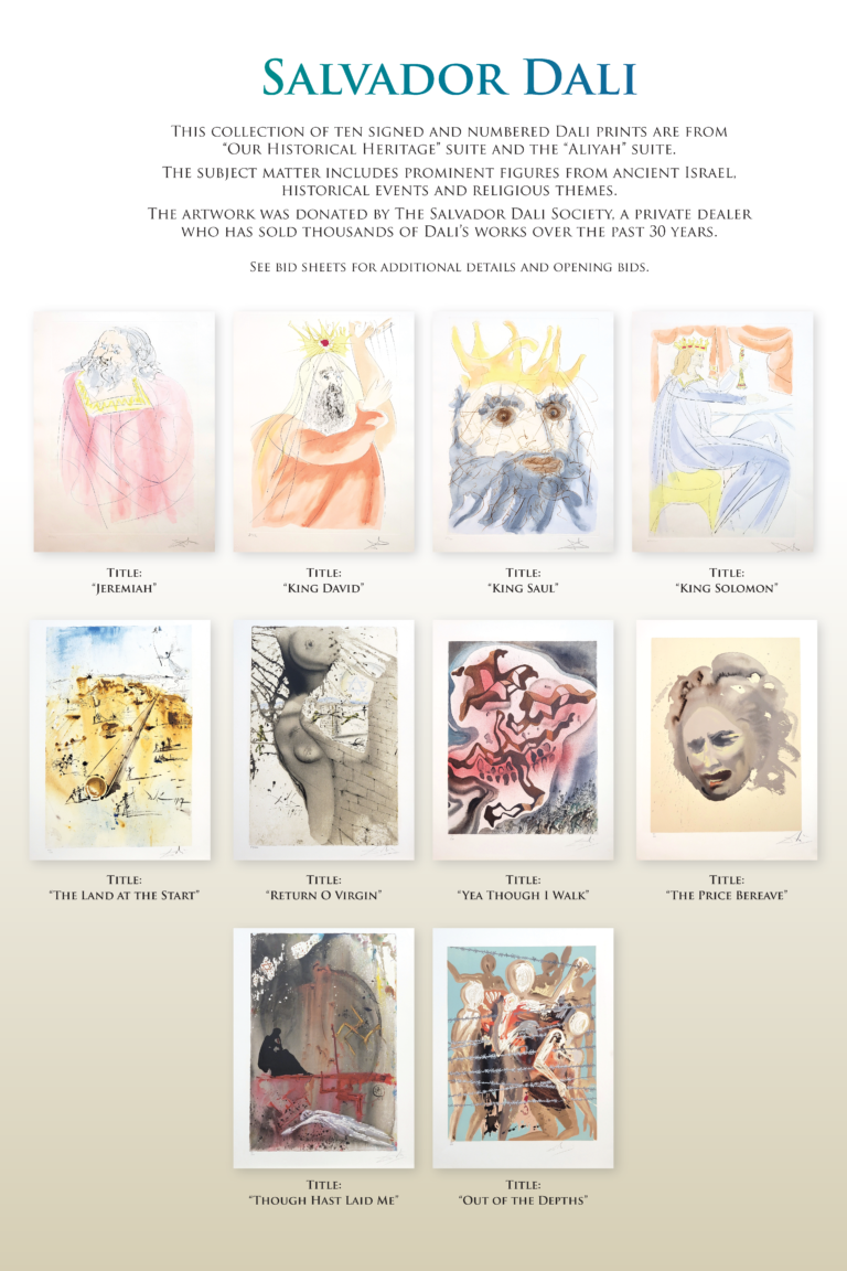 We have over one hundred items for bidding which will include fine arts by Raphael Abecassis, Shem Tov, Thomas Cain, Salvador Dali, Arthur Szyk, Erte and many others. Our sports memorabilia include autographed items by Kobe Bryant, Tom Brady, Sandy Koufax, Mike Tyson, Shohei Ohtani and more. We have gift certificates to gourmet restaurants, gift basket surprises, facials, teeth whitening, photo sessions, jewelry, Lakers tickets, specialty wine, private airplane flight to Catalina Island and more. We have over 10 fabulous vacation packages such as a Turks and Caicos, Bali Luxury Villa, Bella Toscana in Italy, Calistoga Wine Tour, Mexico, Iceland, Colorado Ski Adventure, Kauai and more.