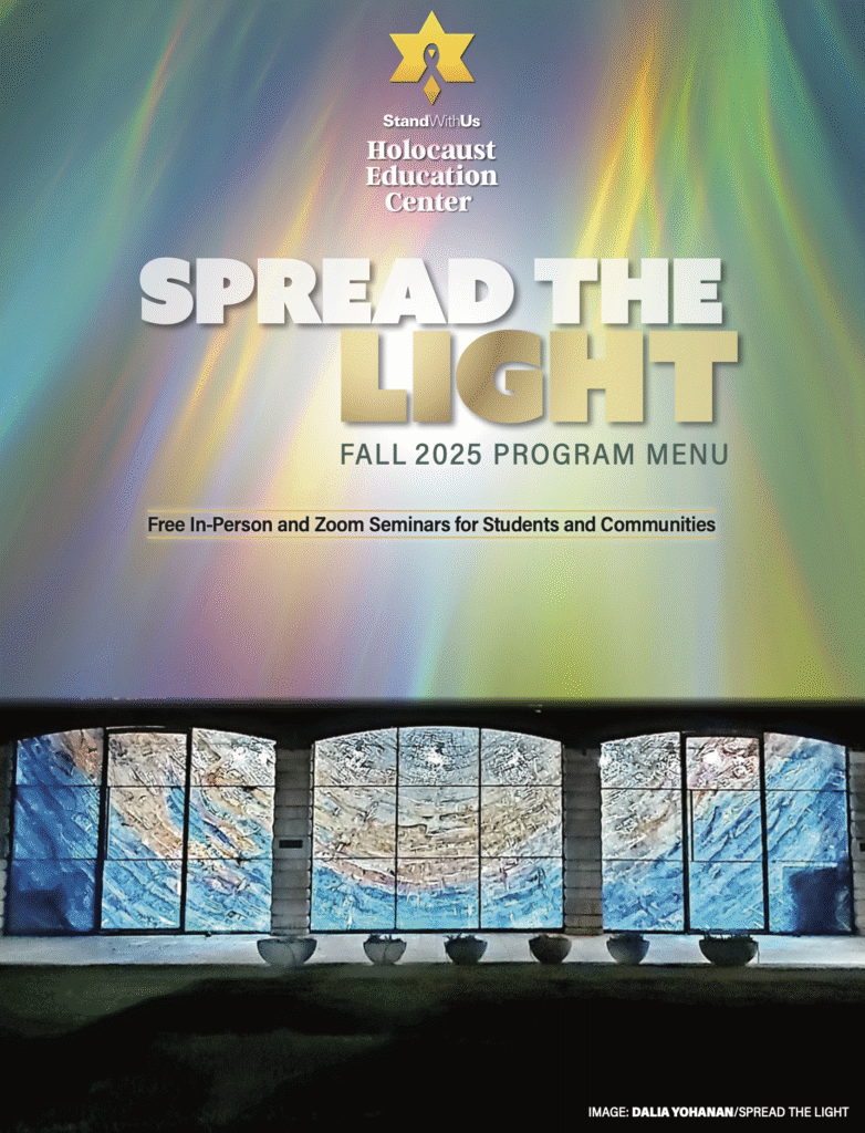 This year’s commemoration of Kristallnacht is an opportunity to “Spread the Light,” which is the name of an Israeli initiative for synagogues and other Jewish buildings to keep their lights on during Kristallnacht. The StandWithUs Holocaust Education Center (HEC) is proud to partner with Spread the Light and its mission of elevating resilience and Jewish unity while commemorating Kristallnacht.