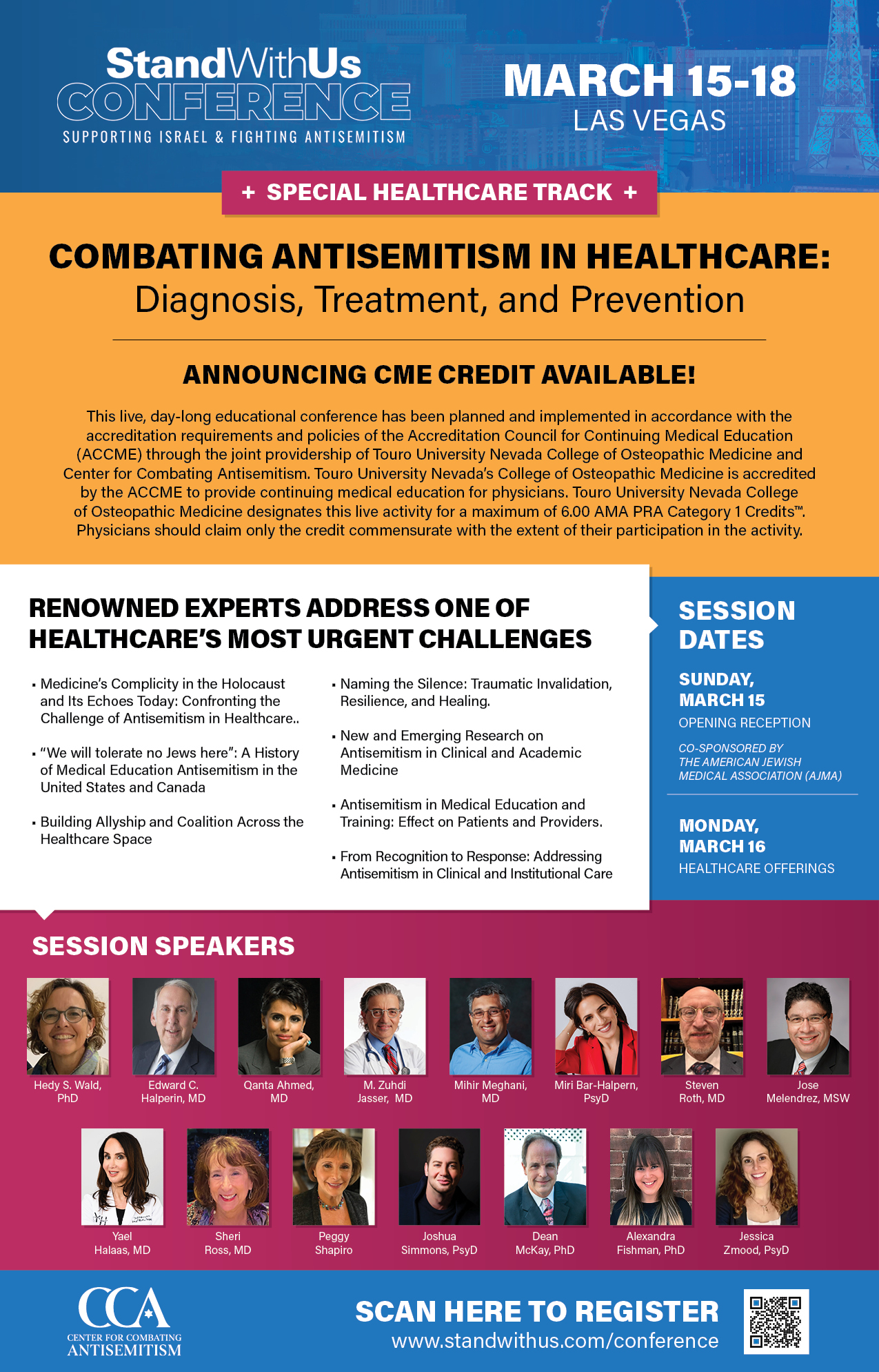 (Las Vegas, NV, February 3, 2026) Responding to the growing impact of antisemitism on Jewish patients, healthcare professionals, and medical institutions, the Center for Combating Antisemitism (CCA) will host the first full-day healthcare-focused conference on antisemitism offering Continuing Medical Education (CME) credit for physicians.