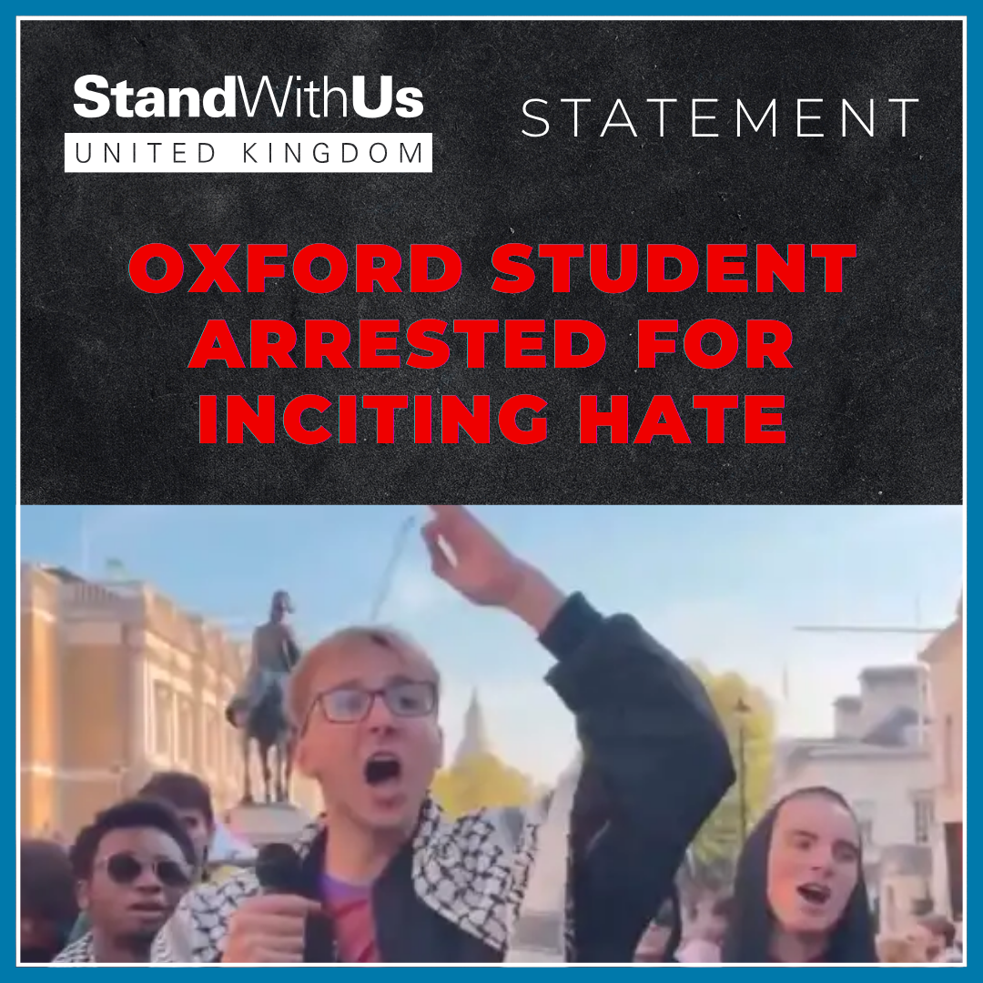 StandWithUs UK welcomes the swift action taken by law enforcement and the University of Oxford following the arrest of a student who was filmed chanting inflammatory and hateful messages during a protest in London on 11 October 2025.